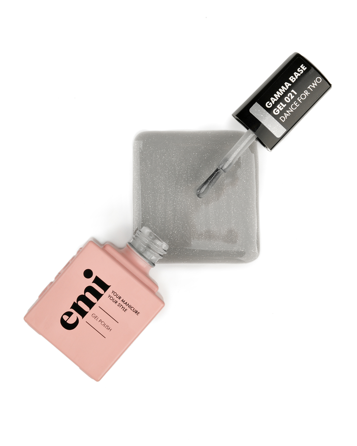 E.MiLac Gamma Base Gel №021 Dance for two – холодный серебристо-серый оттенок с вкраплениями мелких шиммерных частиц.